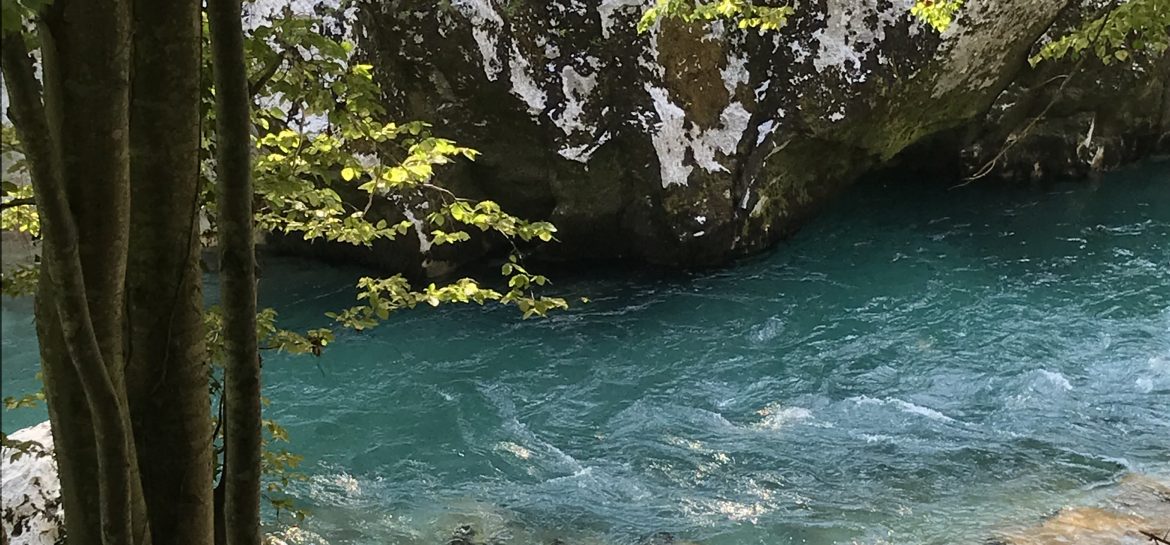 Kleiner Abstecher ans Soca-Ufer verschafft aber kurzzeitig Abkühlung: mir nur Eis-Füße, Alex stürzt sich mutig in die Fluten- mir würde das ja einen Herzinfarkt bescheren…